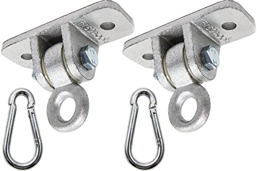Jungle George Swings Co. Heavy Duty Swing Hangers (1 Pair)Have your kids and grandchildren play outside with healthy activity. Or hang your favorite hammock seat on your porch and enjoy the weather with our Super Heavy Duty Swing Hangers.USAGE: Ideal for so many types of swings mounted on Porch, Wood, or Concrete: hammocks, baby bucket swings, belt swings, trapeze swings for Indoors or Outdoors.KIDS LOVE SWINGS: Essential to developing balance, agility, and sharp motor skills, swings are not only fun but healthy for your kids and grandchildren.INSTALLATION: 2 Pre-Drilled 1/2" Holes. Simply mount the Swing Hangers using Carriage Bolts with Locking Nuts (which are not included).CONSTRUCTION: Made of Ductile Iron, you can visibly SEE and FEEL the high quality. These are the Swing Hangers that will complete your dream project. (Maximum load of 1260 lbs. Safe operating load up to 500 lbs).RUST-FREE: Jungle George Swings Co. Heavy Duty Swing Hangers are 3X coated and 3X baked with DACROMET®. Water-based, Dacromet is environmentally friendly and has been used worldwide for more than 35 years for high performance corrosion protection.